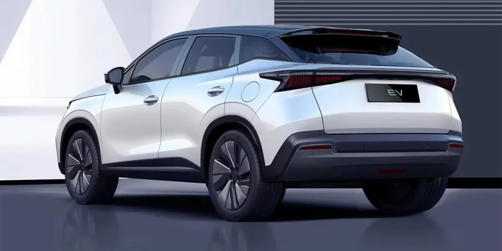از نمای جانبی به جز تغییر فرم رینگ‌های آلیاژی، تفاوت دیگری با مدل بنزینی احساس نمی‌شود و نهایتا در قسمت انتهایی اف ایکس برقی نیز شکل سپر عقب به دلیل حذف اگزوز و دیفیوزر تغییر کرده و نصب نشان نسبتا بزرگ EV بر الکتریکی بودن این خودرو تاکید دارد.